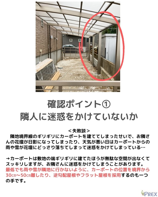 隣地境界線のギリギリにカーポートを建ててしまったせいで、お隣さんの花壇が日影になってしまったり、天気が悪い日はカーポートからの雨や雪が花壇にどっさり落ちてしまって迷惑をかけてしまっている…