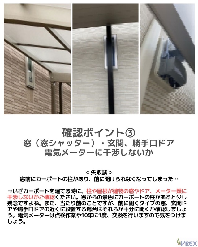 いざカーポートを建てる時に、柱や屋根が建物の窓やドア、メーター類に干渉しないかご確認ください。窓からの景色にカーポートの柱があると少し残念ですよね。また、当たり前のことですが、前に開くタイプの窓、玄関ドアや勝手口ドアの近くに設置する場合はそれらが十分に開くか確認しましょう。電気メーターは点検作業や10年に1度、交換を行いますので気をつけましょう。