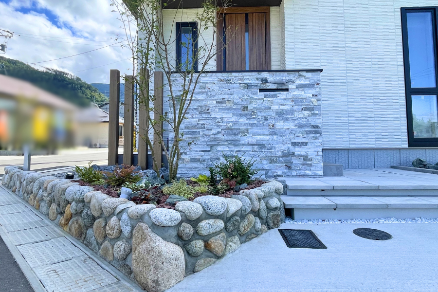 石や植栽などの自然物と、アルミ角材などの人工物のバランスの取り方が上手です。