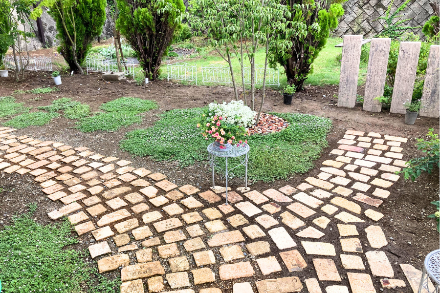 可愛らしいアプローチとクラピアという地被植物を植えたお庭。