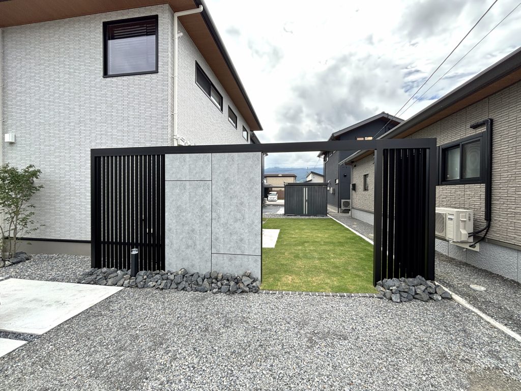 駐車場の奥に広がるお庭の手前には、LIXIL「+G」シリーズを使った目隠しウォールを設置しました。
